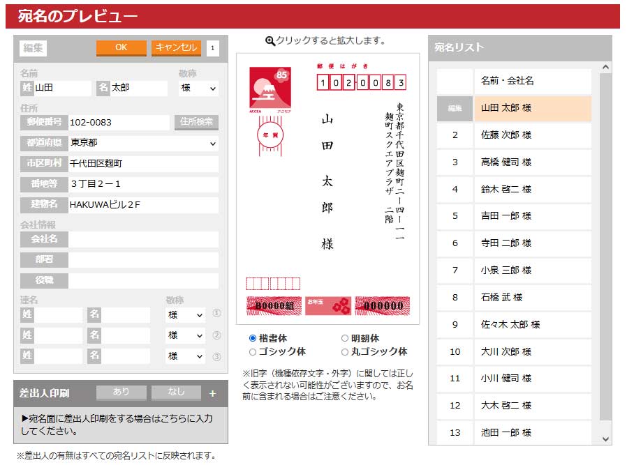 お任せでの宛名印刷サービス(有料)もお受けしております。