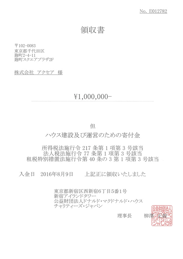 アクセアは2016年8月9日、1,000,000円をドナルド・マクドナルド・ハウスへ寄付いたしました。